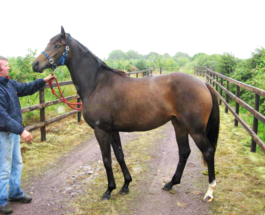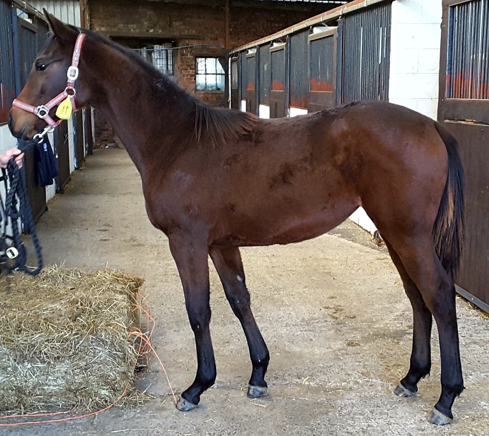 Unfortunately, whilst in the process of relocation she suffered a slight injury to a hind fetlock that became badly infected before she got to us. When our vet, Phil Dyson, saw her he described her as ‘a dead horse walking’. However, he attempted what he described as the ‘desperate remedy’ of removing the tendon at the site of the infection. This saved her life; but there remained a significant bump on the site of the operation and it was impossible to sell her as a store. Even when she had shown her ability by placing twice in France, a prospective sale fell through after she was ‘spun’ by the vet.