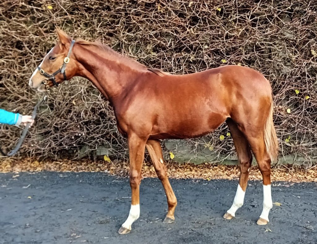 She got in foal on her first cover and produced a chestnut filly in February 2023. Unfortunately, she was not untypical of a first foal in being rather small; neither was she a particulatly good walker. At the Tattersalls November sale in December I wanted her on the market fairly swiftly. Simon, whose most positive comment had been that he ‘didn’t dislike her’ put in a couple of bids but stopped at around the 8,000 mark. The filly was knocked down for €8,500 to the Irish agent Toby Jones, bidding by phone to buy her to race in France.